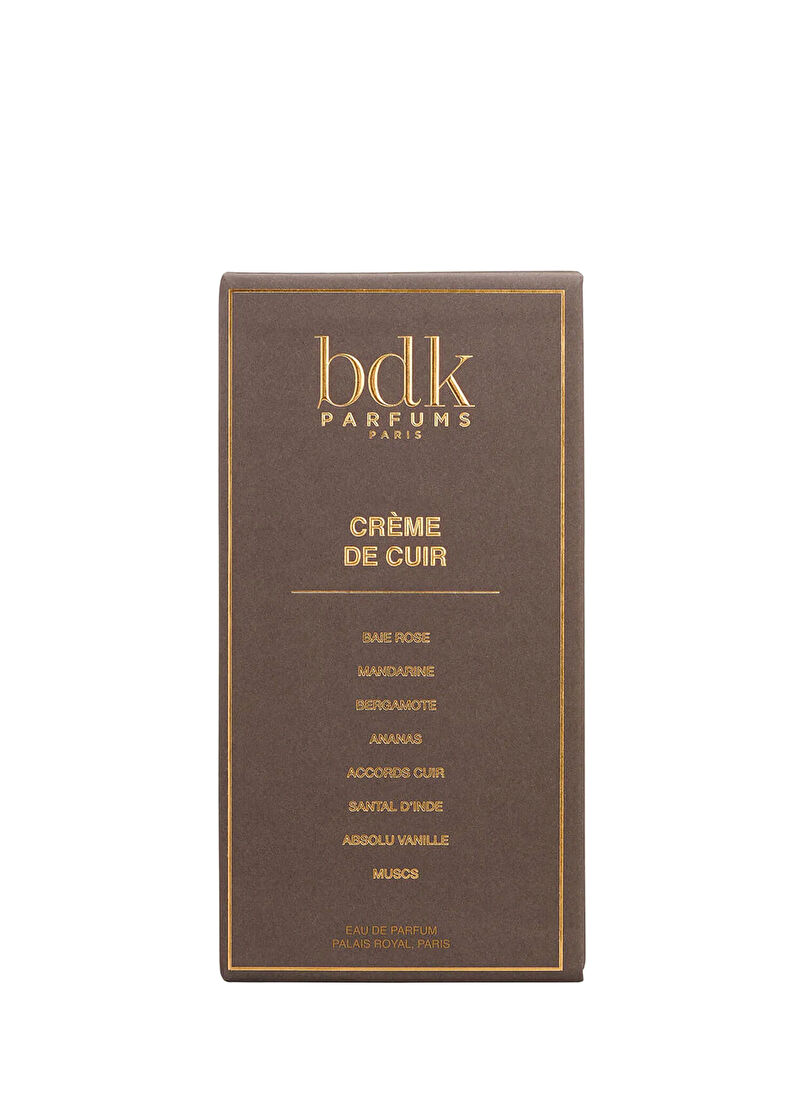 Crème de cuir eau de parfum da bir istisna değil ve narin akorlarla dolu Tüm hayvansal notaları toz haline getiren derimsi bir koku olan bu meyve suyu, ciltte nazikçe duran beyaz bir süet gibidir Üstte, mandalina ve bergamot gibi turunçgil yaprakları notayı tazeler; ressam Rothko'nun bej ve beyaz monokromlarından esinlenmiştir Üst notalarda mandalina, bergamot ve ananas, orta notalarda pembe biber, süet akorları ve Hint sandal ağacı, son nota