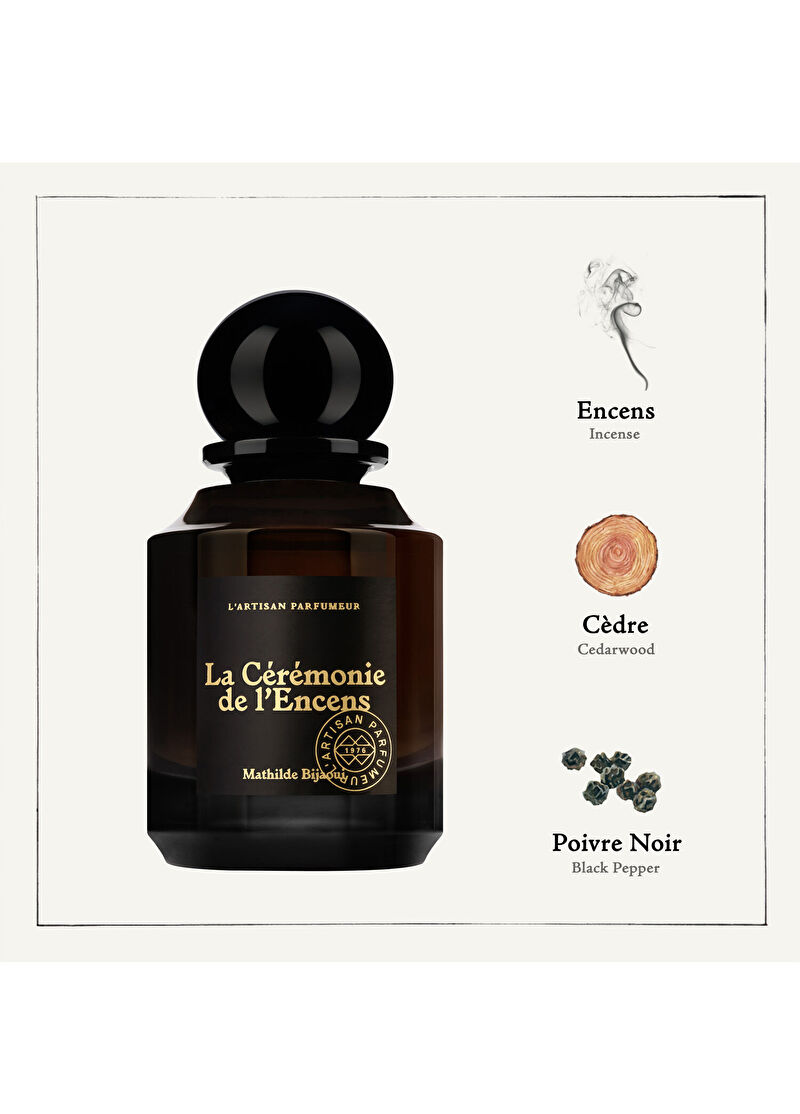 Mathilde Bijaoui tarafından ortaya çıkarılan bu benzersiz koku, La Cérémoniede l'Encens, olibanum tütsüsüne bir övgü niteliği taşıyor Olibanum Tütsüsü, odunsu, baharat ve turunçgil notalarıyla harmanlanan binlerce yıllık bir reçineden gelir Bu mistik koku da biber ve sedir ağacının birleşimini dengeler La Ceremonie de L’encens dünyevi ve ilahi olanı bir araya getirerek insanın içindeki derinlikleri uyandırma gücünü elinde tutar