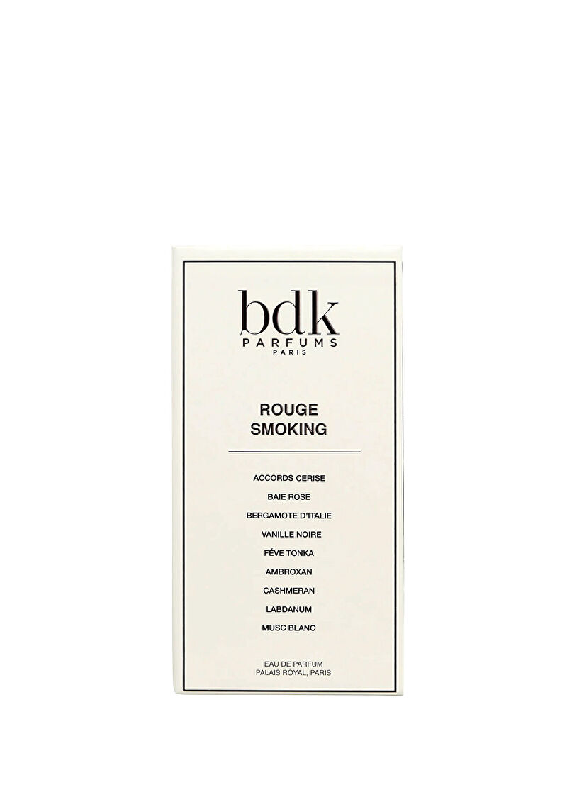 Rouge Smoking Eau de Parfum, duyusal ve narin akorlarla dolup taşan bir istisna değil Meyveli, kehribar ve baharatlı olan bu koku,tatlılık ve canlılığı harmanlayan Pigalle bölgesinden esinlenmiştir Koku, bergamotun tazeliğiyle tezat oluşturan pembe karabiberinbaharatlı üst notasına sahiptir Kiraz çekirdeği akoruna siyah vanilya mutlak notası, tonka fasulyesi ve beyaz misk eşlik eder Üstnotalarda İtalyan bergamotu, kiraz akoru ve pembe biber,
