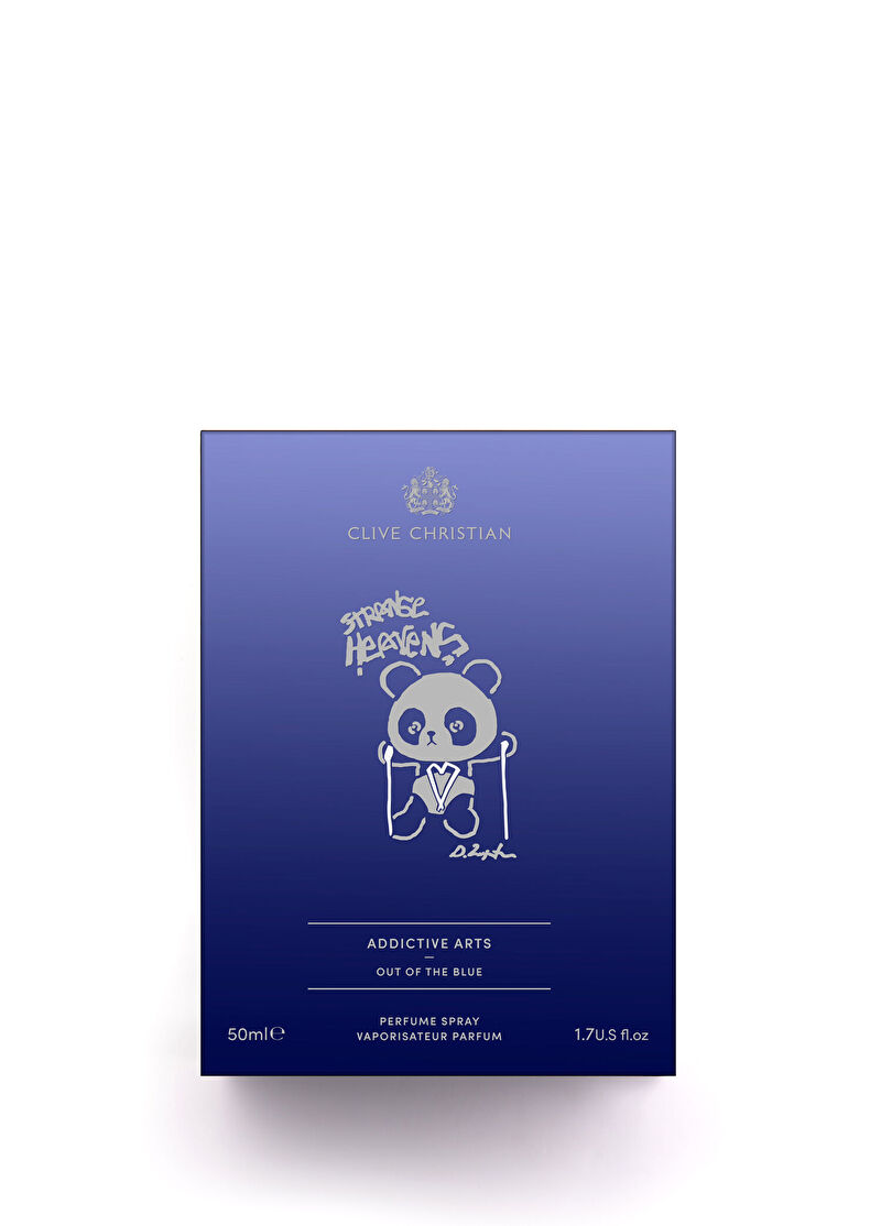 Ünlü çağdaş sanatçı Domingo Zapata, özel bir ortaklıkla, imzası niteliğindeki panda motifini parfüm şişesinin tasarımına taşıyor Denge, neşe ve oyunbaz gizemin sembolü olan panda, parfümün esrarengiz duyusallığına karşı cesurca duruyor %25 parfüm yağı konsantrasyonundan oluşan paradoksal bir parfüm Strange Heavens Out Of The Blue, kahve ve anasonun uyandırıcı etkisi ile açılıyor, ardından yasemin, portakal çiçeği ve özel Addictive Fusion ak