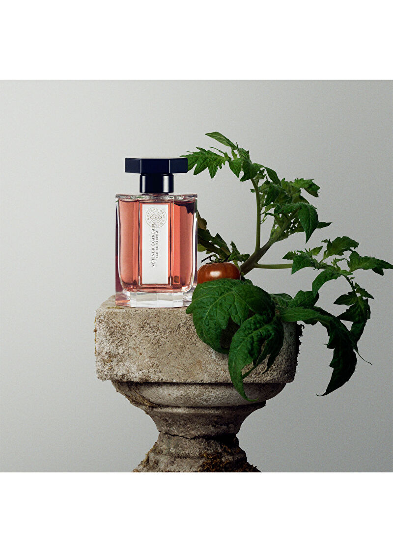 Vétiver Écarlate, domates yapraklarının sıcak yaz anısını sergiliyor Bu yeşil, asidik ve meyveli koku, vetiverin koyu, canlı notaları arasında bir kontrast sunuyor Üst notalarda, greyfurt ve bergamot domates yaprağının tazeliğini öne çıkarıyor Siyah frenk üzümü tomurcuğu sebzenin asidik ve meyveli nüanslarını vurguluyor Son olarak zencefil, bu bitkisel ve odunsu notaya bir tutam baharat katıyor